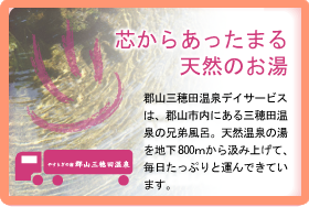 天然の温泉を使ったお風呂とおいしいお食事でお迎えします。まこも湯、サウナもお楽しみください。